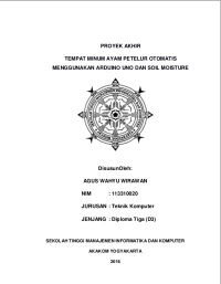 INTISARIrnPada masa sekarang ini sebuah komputer berkembangrndengan pesat dan memiliki banyak fungsi diantaranya pengolahanrndata, pengontrolan dan banyak lagi fungsi lainnya. Salah saturnfungsi sebuah komputer adalah sebagai perantara antara sebuahrnalat dengan user. Salah satu bentuknya adalah dengan bantuanrnsuatu mikrontroller misalnya Arduino Uno. Namun masih terdapatrnbeberapa hal yang masih belum efisien dalam dimensi komputerrnyang besar dan penggunaan daya yang besar.rnDengan memanfaatkan Arduino Uno di tambah denganrnsensor soil moisture sebagai pendeteksi akan menjadikan lebihrnefisien. Arduino yang digunakan adalah Arduino Uno R3. ArduinornUNO mempunyai 14 pin digital input/output (6 di antaranya dapatrndigunakan sebagai output PWM), 6 input analog, sebuah osilatorrnKristal 16 MHz, sebuah koneksi USB, sebuah power jack, sebuahrnICSP header, dan sebuah tombol reset. Arduino UNO memuatrnsemua yang dibutuhkan untuk menunjang mikrokontroler, mudahrnmenghubungkannya kesebuah computer dengan sebuah kabelrnUSB atau mensuplainya dengan sebuah adaptor AC ataurnmenggunakan baterai untuk memulainya.rnSalah satu peralatan ternak yang dibuat adalah tempatrnminum ternak ayam otomatis. Dengan memanfaatkan fitur Arduinornuno dan soil moisture, tempat minum ternak ayam dapat dideteksirndan diisi ulang volume airnya secara otomatis.rnBerdasarkan permasalahan tersebut, maka penulisrnmengajukan judul “TEMPAT MINUM AYAM PETELUR OTOMATISrnMENGGUNAKAN SENSOR SOIL MOISTURE”.rn