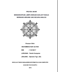 INTISARIrnPada masa sekarang ini sebuah komputer berkembang denganrnpesat dan memiliki banyak fungsi diantaranya pengolahan data,rnpengontrolan dan banyak lagi fungsi lainnya. Salah satu fungsi sebuahrnkomputer adalah sebagai perantara antara sebuah alat dengan user.rnSalah satu bentuknya adalah dengan bantuan suatu mikrontrollerrnmisalnya Arduino Uno. Namun terdapat ketidak efisiensian dalam dimensirnkomputer yang besar dan penggunaan daya yang besar.rnDengan memanfaatkan Arduino Uno di tambah dengan saklar togglernsebagai pengontrol akan menjadikan lebih efisien. Arduino yangrndigunakan adalah Arduino Uno R3. Arduino UNO mempunyai 14 pinrndigital input/output (6 di antaranya dapat digunakan sebagai output PWM),rn6 input analog, sebuah osilator Kristal 16 MHz, sebuah koneksi USB,rnsebuah power jack, sebuah ICSP header, dan sebuah tombol reset.rnArduino UNO memuat semua yang dibutuhkan untuk menunjangrnmikrokontroler, mudah menghubungkannya kesebuah computer denganrnsebuah kabel USB atau mensuplainya dengan sebuah adaptor AC ataurnmenggunakan baterai untuk memulainya. Berdasarkan permasalahanrntersebut, maka penulis mengajukan judul “MENGHIDUPKAN LAMPUrnDENGAN SAKLAR TOGGLE BERBASIS ARDUINO UNO SECARArnANALOG”.rnKata kunci : User, mikrokontroler, Arduino UNO, saklar, toggle.rn
