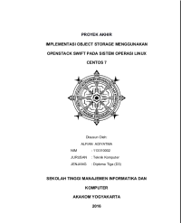 INTISARIrnImplementasi Object Storage menggunakan openstack swiftrnpada sistem operasi linux Centos 7rnImplementasi Object Storage menggunakan openstack swiftrnpada sistem operasi linux Centos 7. Berguna untuk digunakanrnsebagai data penyimpanan berbasis object, object storage merupakanrnjenis penyimpanan yang digunakan untuk cloud storage, denganrnmetodernpengaksesanrnmenggunakanrnRESTFULLrnservices,rnpembangunan object storage ini menggunakan platform OpenstackrnSwiftrnPada Project Akhir ini dikembangkan sebuah aplikasi objectrnstorage menggunakan openstack swift pada sistem operasi LinuxrnCentos 7, pada aplikasi dapat diakses melalui cross-platform, Sepertirnmelalui Windows, Linux maupun android.rnAplikasi ini dapat dibangun menggunakan hardisk yang tersediarndi pasaran, menggunakan 1 hardisk atau lebih.rnKata Kuncirn:rnCloudrnComputing,rnObjectrnStorage,CloudrnStorage,OpenStack, OpenStack Swift, Centos 7.rn