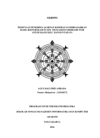 INTISARIrnJaminan kesehatan merupakan sebuah jaminan bagi seorang sakit,rnsehingga dapat meringankan biaya pengobatan. Jaminan kesehatan yangrndeberikan pemerintah bermacam – macam yaitu JAMKESMAS danrnJAMKESDA. Namun dalam penentuannya masih terdapat masalah, sehinggarnseorang yang mendapat jaminan kesehatan kurang sesuai dengan jaminanrnkesehtan yang seharusnya di dapat. Untuk memetakan seberapa banyak di suaturndesa atau kecamatan yang menerima jaminana kesehatan, dan mencari lokasirntempat tinggal seorang penerima jaminan kesehatan juga belum memadai.rnMetode Fuzzy Tsukamoto ialah salah satu dari 3 metode Logika Fuzzyrndimana metode Fuzzy Tsukamoto memiliki rule yaitu menetukan nilai fungsirnkeanggotaan dari tiap variabel kemudian nilai tersebut akan di olah ke dalamrnbeberapa aturan yang digunakan dalam metode Fuzzy Tsukamoto. Setelah di olahrnke dalam beberapa aturan di dapatkan nilai R dan z kemudain di lakukanrndefuzifikasi atau penghitungan nilai crips (Z).rnTeknologi yang semakin berkembang seperti sekarang ini dapatrndimanfaatkan untuk berbagai hal terutama dalam mengatasi masalah untukrnmencari lokasi penerima jaminan kesehatan. Salah satu teknologi tersebut adalahrndengan memanfaatkan peta digital untuk memetakkan lokasi penerima jaminanrnkesehatan atau bisa disebut dengan GIS (Geographic Information System).rnDengan adanya teknologi tersebut lokasi penerima jaminan kesehatan dapatrndipetakkan atau ditampilkan ke dalam peta digital dengan menggunakan koordinatrndari lokasi penerima jaminan kesehatan tersebut.rnHasil dari penelitian ini diimplementasikan ke dalam sebuah sistem yangrndapat memetakkan penerima jaminan kesehatan dengan menggunakan teknologirnpeta digital google map api. Kemampuan dari sistem ini dapat menentukan salahrnsatu dari 3 kriteria penerima jaminan keshatan yaitu JAMKESMAS, JAMKESDArndan NonJamkes dengan menggunakan nilai dari variable penentu, peneyebab danrnpendukung, pemetaan penerima jaminan kesehatan, menampilkan batas desa,rnmenampilkan informasi, dan dapat melakukan pencarian penerima jaminanrnkesehatan. Data yang digunakan ialah 50 data dimana nanti hasil indetifikasi fuzzyrntsukamoto dari 50 data tersebut akan dibandingkan dengan 50 data asli untukrnmenentukan tingkat akurasi. Hasil dari perbandingan tersebut diperoleh tingkatrnakurasinya ialah 86%.rnKata Kunci: Fuzzy Tsukamoto, GIS, Google Map API , Jaminan Kesehatanrn